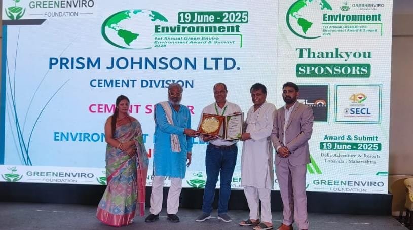 प्रिज्म जॉनसन लिमिटेड (सीमेंट डिवीजन) को पर्यावरण प्रबंधन एवं सतत विकास के क्षेत्र में उल्लेखनीय योगदान के लिए प्रथम वार्षिक ग्रीन एनवायरो पर्यावरण पुरस्कार एवं सम्मेलन 2025” के अंतर्गत पर्यावरण उत्कृष्टता श्रेणी में सम्मानित किया गया। यह सम्मान 19 जून 2025 को डेला एडवेंचर एंड रिसॉर्ट, लोनावला, महाराष्ट्र में आयोजित कार्यक्रम में प्रदान किया गया। प्रिज्म जॉनसन लिमिटेड की ओर से सहायक महाप्रबंधक बिहारी सिंह शेखावत (पर्यावरण विभाग) ने यह अवार्ड प्राप्त किया।