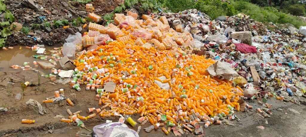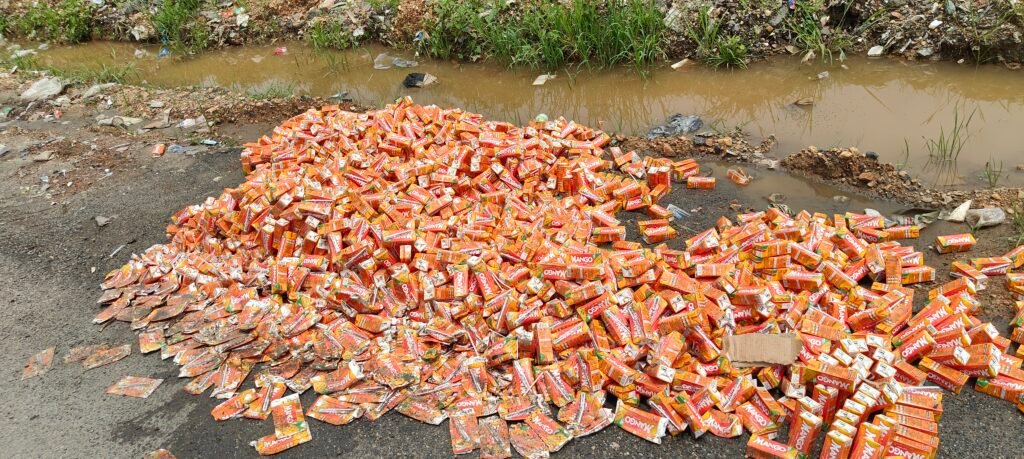 रायगढ़ रोड से पत्थलगांव में प्रवेश करने पर नंदन झरिया पुल के पास का नजारा चौंकाने वाला है। पुल के किनारे सैकड़ों की संख्या में पैक्ड ‘मैंगो जूसी ड्रिंक’ की एक्सपायर बोतलें और पाउच सड़क व नाले में फेंके गए हैं।