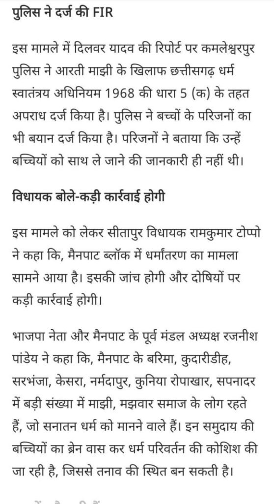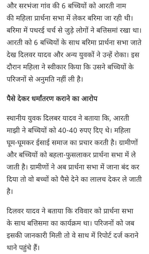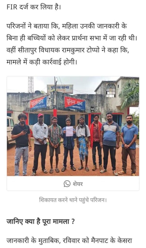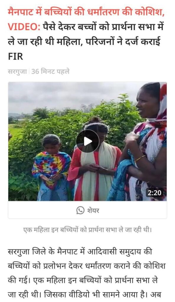 मैनपाट में बच्चियों की धर्मांतरण की कोशिश पैसे देकर बच्चों को प्रार्थना सभा में ले जा रही थी महिला परिजनों ने दर्ज कराई f i r