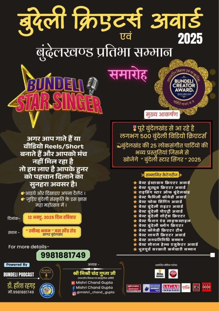 सागर। बुंदेलखंड की कला, संस्कृति और भाषा को राष्ट्रीय स्तर पर पहचान दिलाने की दिशा में एक विशेष पहल के तहत आगामी 12 अक्टूबर 2025, रविवार को रविन्द्र भवन, सागर में “बुंदेली क्रिएटर अवार्ड एवं बुंदेलखंड प्रतिभा सम्मान समारोह” का भव्य आयोजन किया जाएगा,इस समारोह का नेतृत्व प्रसिद्ध समाजसेवी व बुंदेली संस्कृति के प्रचारक डॉ. हरीश रहगड़ कर रहे हैं। पेशे से डॉक्टर और “बुंदेली पॉडकास्ट” यूट्यूब चैनल के संस्थापक डॉ. रहगड़ लंबे समय से बुंदेलखंड की बोली, लोककला और संस्कृति को आधुनिक मंच पर प्रस्तुत करने का कार्य कर रहे हैं,कार्यक्रम में बुंदेलखंड के यूट्यूब, फेसबुक, इंस्टाग्राम क्रिएटर्स, गायक, लोककलाकार व समाजसेवी एक साझा मंच पर अपनी प्रतिभा का प्रदर्शन करेंगे। आयोजन में चयनित कलाकारों को प्रथम, द्वितीय और तृतीय पुरस्कार स्वरूप विशेष कैश प्राइज प्रदान किए जाएंगे। साथ ही, बुंदेली संस्कृति और समाजसेवा के क्षेत्र में उल्लेखनीय योगदान देने वाले व्यक्तित्वों को प्रतिभा सम्मान से नवाज़ा जाएगा,समारोह में समाजसेवी मिश्रीचंद गुप्ता का विशेष सहयोग रहेगा। गुप्ता जी वर्षों से गरीबों व जरूरतमंदों की सहायता और सांस्कृतिक कार्यक्रमों को बढ़ावा देने में सक्रिय भूमिका निभा रहे हैं।
