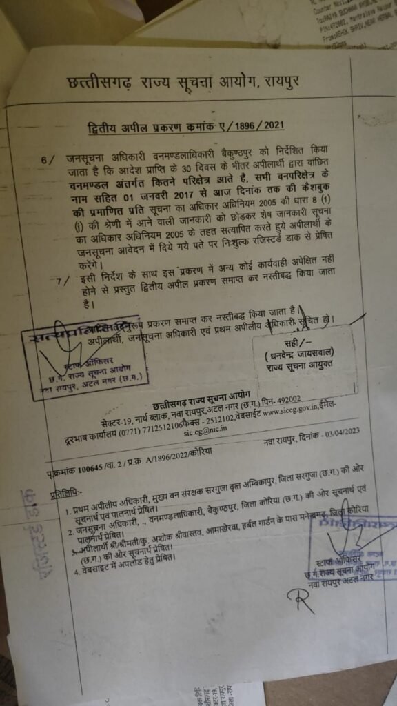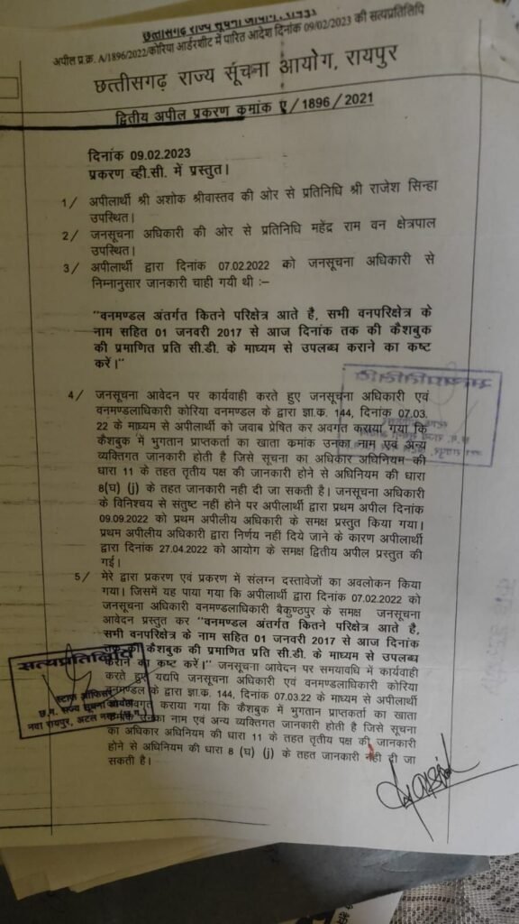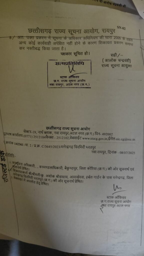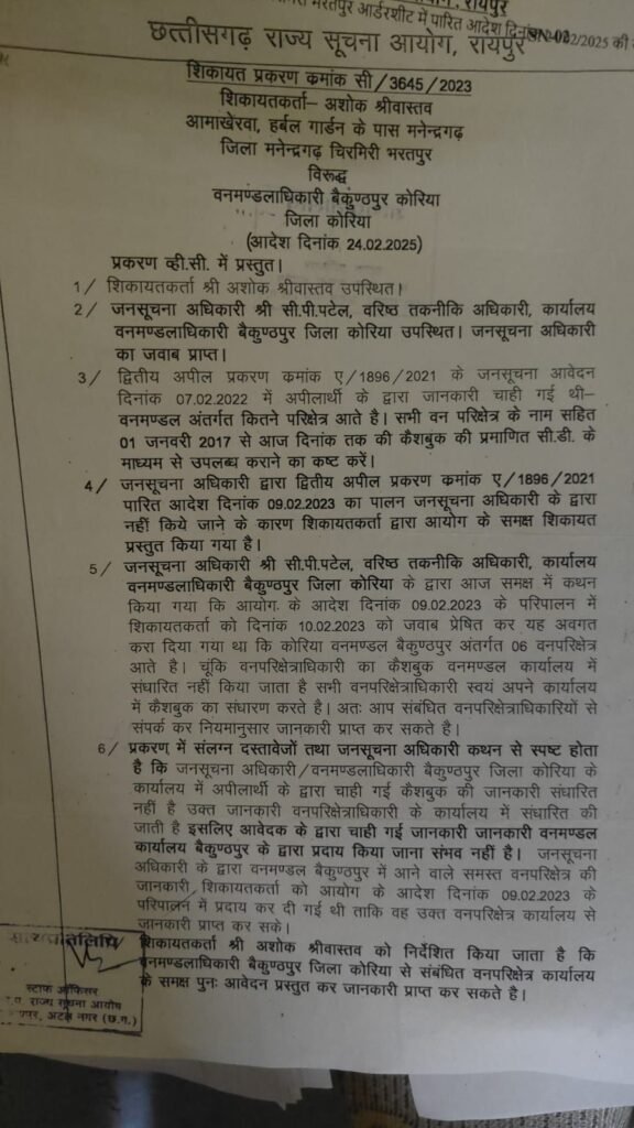 सूचना के अधिकार (RTI) को पारदर्शिता और जवाबदेही का सशक्त औजार माना जाता है, लेकिन छत्तीसगढ़ राज्य सूचना आयोग की कार्यशैली अब कटघरे में खड़ी है। मामला मनेन्द्रगढ़ के आरटीआई कार्यकर्ता अशोक श्रीवास्तव से जुड़ा है, जिन्होंने वन विभाग से 2017 से 2022 तक की कैशबुक की जानकारी मांगी थी।