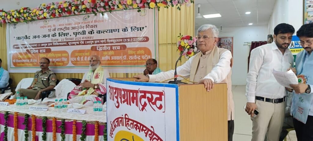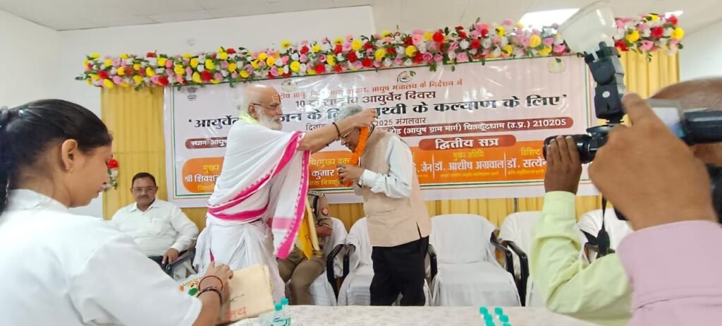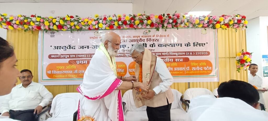 संत रणछोड़ दास जी महाराज द्वारा स्थापित विश्व ख्याति प्राप्त श्री सद्गुरु नेत्र चिकित्सालय के निदेशक एवं एम्स रायपुर के अध्यक्ष पद्मश्री डॉ बी के जैन द्वारा आज आयुष ग्राम चिकित्सालय सूरजकुंड रोड चित्रकूट में 10 वें राष्ट्रीय आयुर्वेद दिवस के द्वितीय सत्र आयोजन का उद्घाटन किया गया उद्घाटन आयोजन में पहुंचे डॉ जैन का आयुष ग्राम ट्रस्ट के संस्थापक डॉ मदन गोपाल बाजपेई और उनकी पूरी टीम ने जोरदार स्वागत किया ।यह कार्यक्रम भारत सरकार आयुष मंत्रालय द्वारा निर्धारित विषय आयुर्वेद जन जन के लिए पृथ्वी के कल्याण के लिए आयोजित किया जा रहा है इसमें जनजागरुकता,सामुदायिक सहभागिता,के अंतर्गत आयुर्वेद संगोष्ठी , निःशुल्क चिकित्सा शिविर,वृक्षारोपण जैसे आदि कार्यक्रम आयोजित होगे।इस आयुर्वेद दिवस पर देश के कोने कोने से चिकित्सकों की उपस्थिति रहेगी। मुख्य अतिथि के रूप में पहुंचे पद्मश्री डॉ बी के जैन, एस पी चित्रकूट अरुण कुमार सिंह, आयुष ग्राम के ट्रस्ट के संस्थापक मदन गोपाल बाजपेई और अन्य उपस्थित गणमान्य अतिथियों ने दीप प्रज्वलित कर कार्यक्रम का उद्घाटन किया। तत्पश्चात अपने उद्धबोधन में कहा कि अगर हम अपने आयुर्वेद की क्वालिटी सुधार ले तो हमको एलोपैथ की ओर नहीं जाना पड़ेगा।उन्होंने कहा कि ये पद्मश्री मुझे नहीं आप लोगों को मिला है।अंत में उन्होंने कहा कि अगर आप अपने अंदर अनुशासन, आत्म विश्वास और आत्म शक्ति डाल देंगे तो आप जरूर कामयाब होगे।