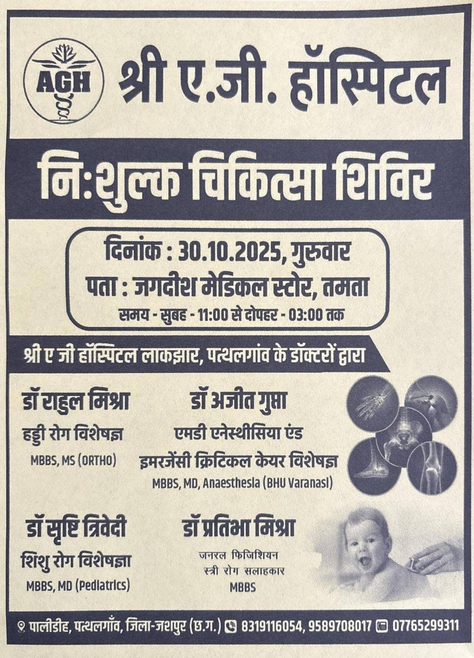 आम नागरिकों के स्वास्थ्य को ध्यान में रखते हुए श्री ए.जी. हॉस्पिटल, लाक्ष्यार, पत्थलगांव की ओर से नि:शुल्क चिकित्सा शिविर का आयोजन किया जा रहा है।