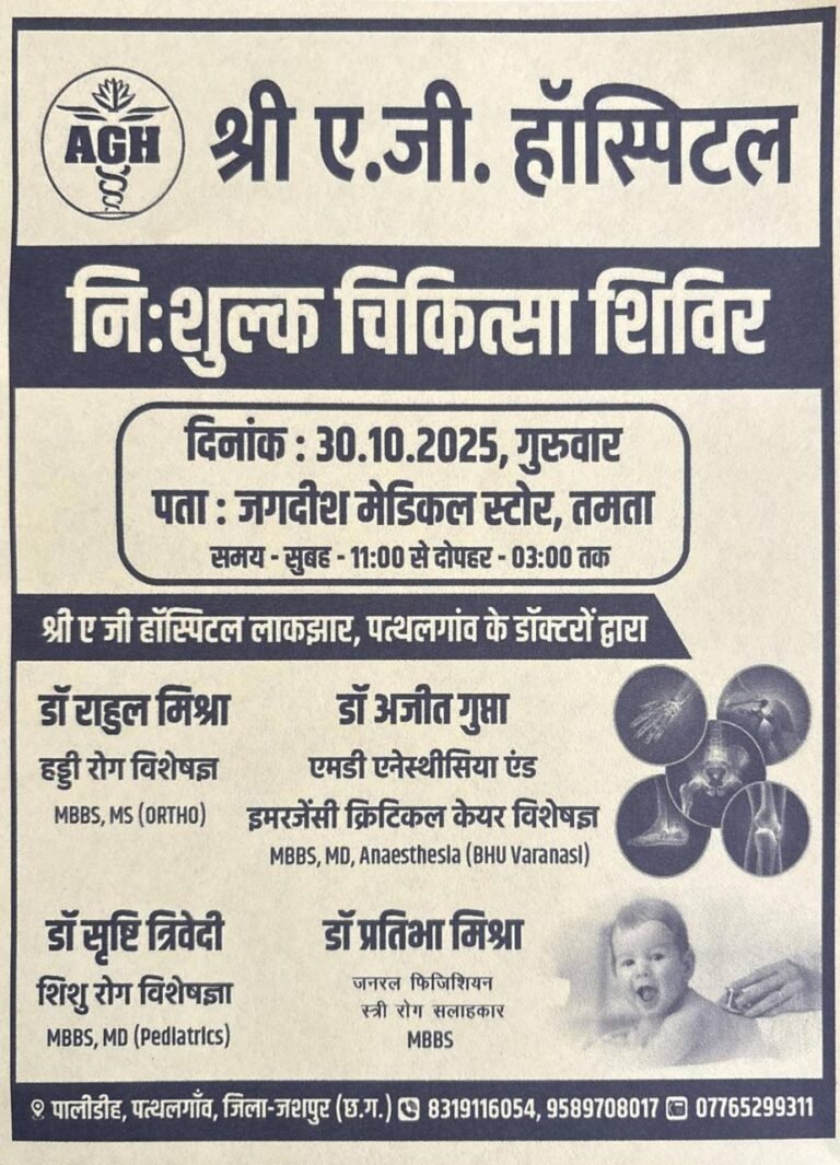तमता / पत्थलगांव।आम नागरिकों के स्वास्थ्य को ध्यान में रखते हुए श्री ए.जी. हॉस्पिटल, लाक्ष्यार, पत्थलगांव की ओर से नि:शुल्क...