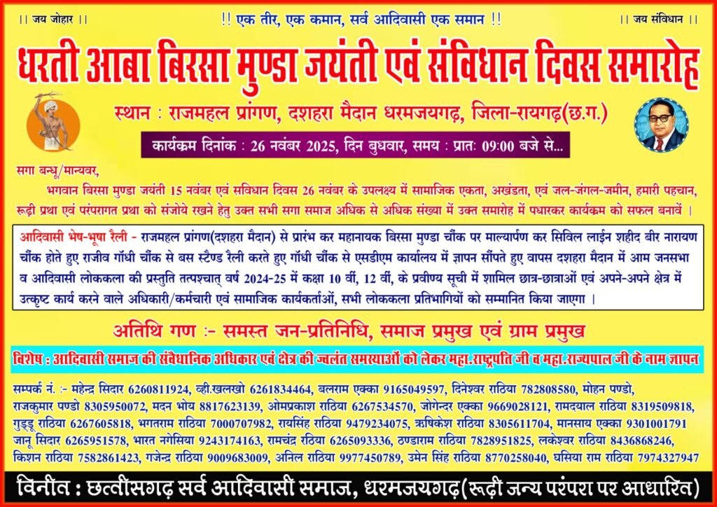 धरमजयगढ़ – धरती आबा भगवान बिरसा मुंडा जयंती (15 नवंबर) एवं संविधान दिवस (26 नवंबर) के उपलक्ष्य में सामाजिक एकता, जनजागरण और जल‒जंगल‒जमीन की पहचान को संजोने के उद्देश्य से 26 नवंबर 2025, बुधवार को राजमहल प्रांगण (दशहरा मैदान) धरमजयगढ़ में भव्य समारोह आयोजित किया जा रहा है। कार्यक्रम सुबह 9 बजे से आरंभ होगा।