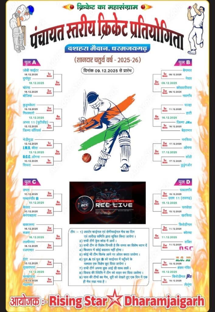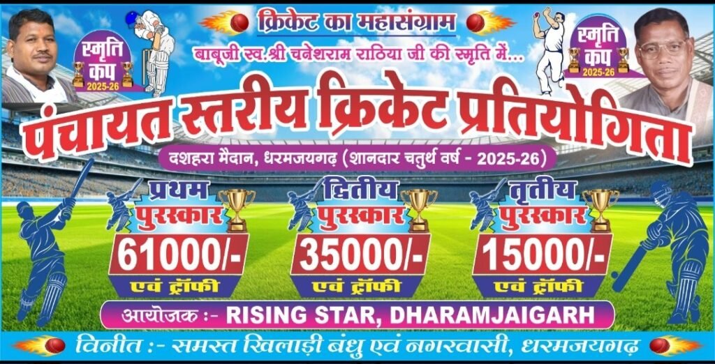 धरमजयगढ़ –  दशहरा मैदान एक बार फिर क्रिकेट के रोमांच से गूंजने वाला है। स्वर्गीय श्री चनेशराम राठिया जी की स्मृति में आयोजित होने वाली पंचायत स्तरीय क्रिकेट प्रतियोगिता स्मृति कप 2025-26 की तैयारियाँ पूरी हो चुकी हैं। आयोजनकर्ता राइजिंग स्टार, धरमजयगढ़ ने इस वर्ष टूर्नामेंट को पहले से भी अधिक भव्य और व्यवस्थित रूप देने का दावा किया है। प्रतियोगिता का शुभारंभ 9 दिसंबर 2025 से होगा, जिसमें कई पंचायतों की टीमें अलग-अलग पूलों में भिड़ेंगी। प्रतिभागी टीमों के बीच 9 से 12 दिसंबर तक बेहद रोमांचक मुकाबलों की पूरी संभावना है।