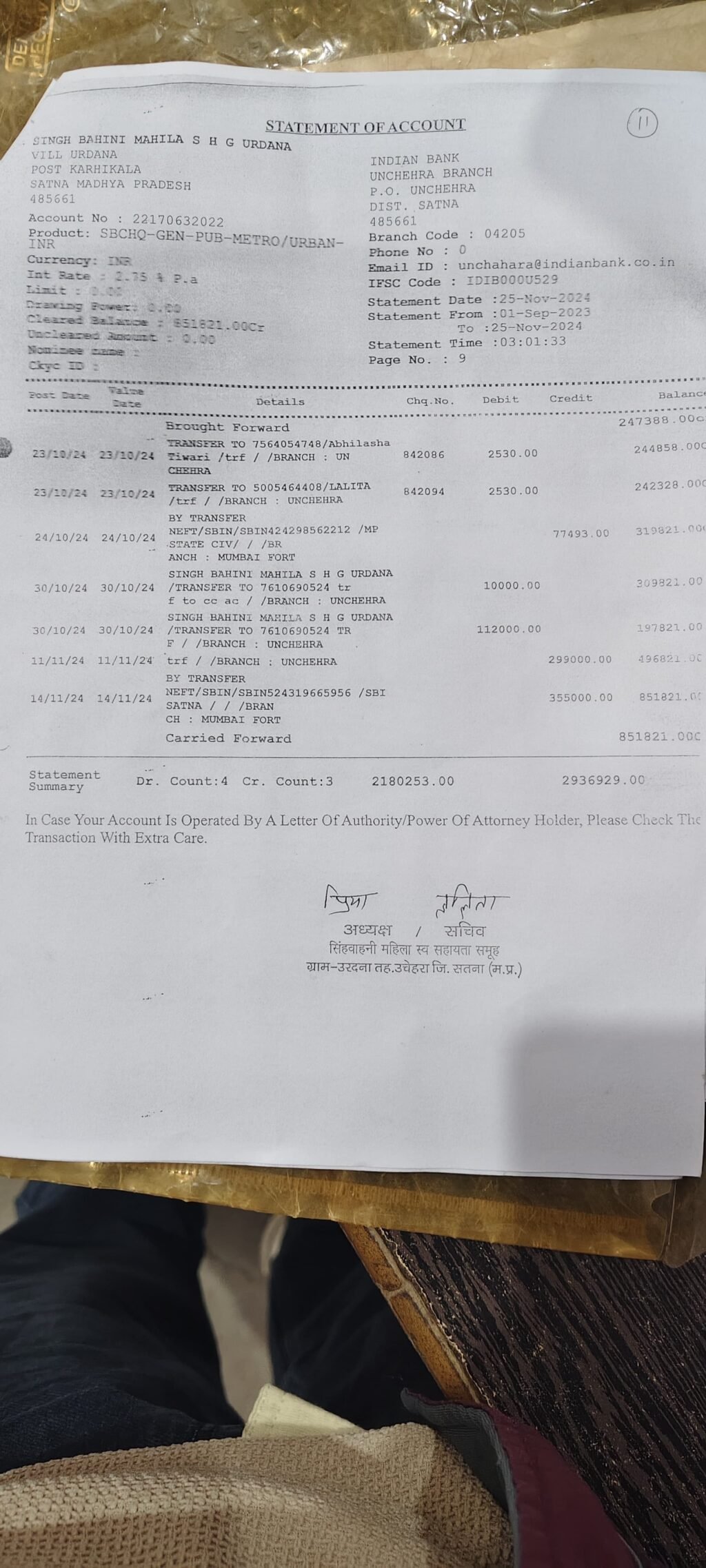 समूह के खाते में ₹2,99,000 रुपये 30/10/2024 को बैंक द्वारा ट्रांसफर किए गए थे, लेकिन तकनीकी कारणों से राशि सिस्टम में शो नहीं हो रही थी।
