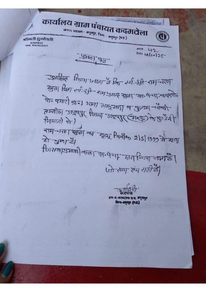 प्रकरण के अनुसार रामचरण गुप्ता नामक व्यक्ति, जो वर्षों पहले ग्राम पंचायत रामपुर से स्थानांतरित हो चुका था, उसकी मृत्यु दर्शाते हुए पंचायत स्तर पर आवेदन प्रस्तुत किया गया। चौंकाने वाली बात यह है कि संबंधित व्यक्ति की मृत्यु का किसी भी शासकीय अस्पताल, स्वास्थ्य केंद्र अथवा पंजीकरण कार्यालय में कोई आधिकारिक रिकॉर्ड उपलब्ध नहीं है।