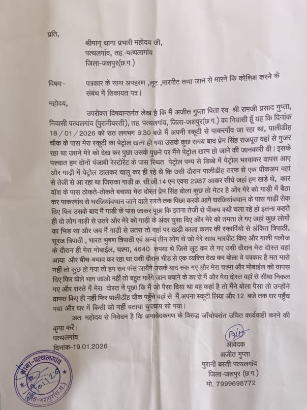 घटना के बाद पत्रकार अजीत गुप्ता ने पत्थलगांव थाना पहुंचकर लिखित शिकायत दर्ज कराई, जिसमें