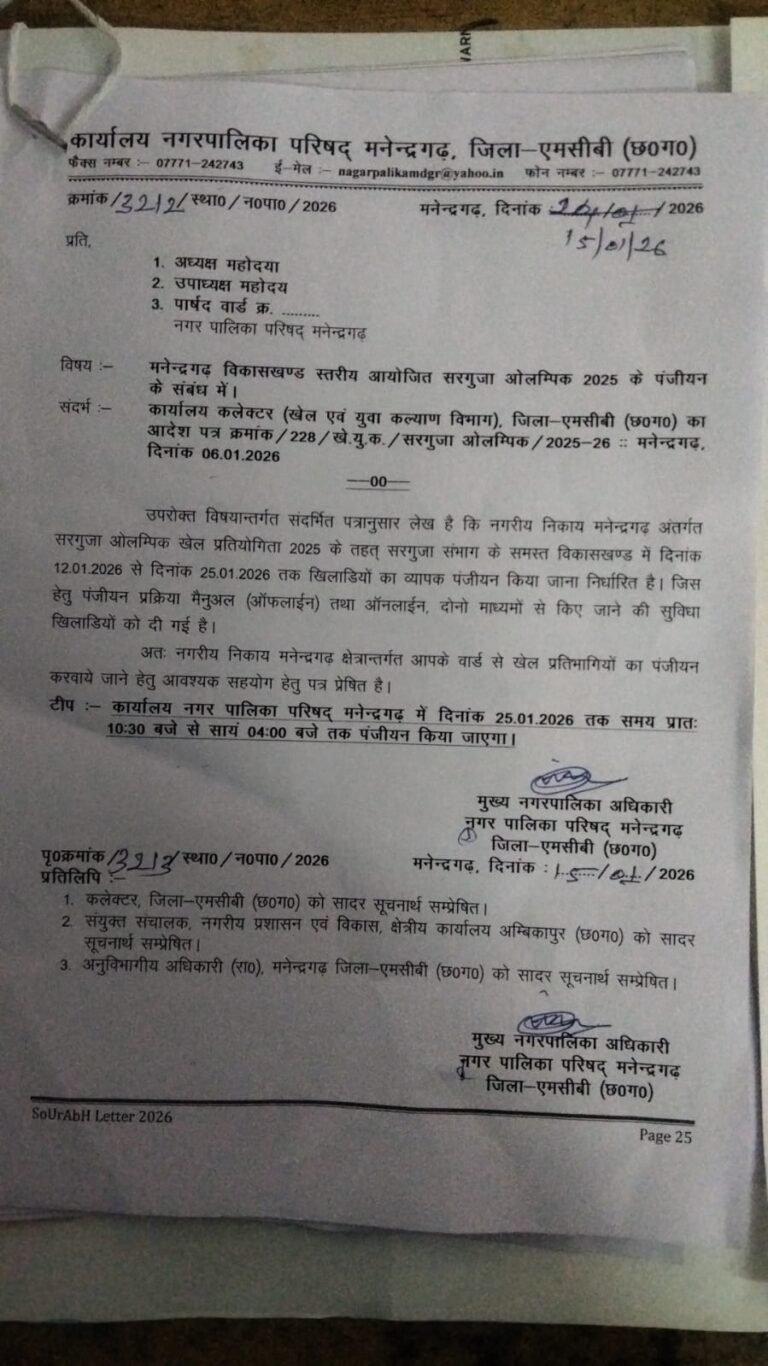 संभाग ब्यूरो दुर्गा गुप्ता मनेंद्रगढ़। सरगुजा ओलंपिक 2025 के अंतर्गत विकासखंड स्तरीय खेल प्रतियोगिताओं के लिए खिलाड़ियों का पंजीयन प्रारंभ...