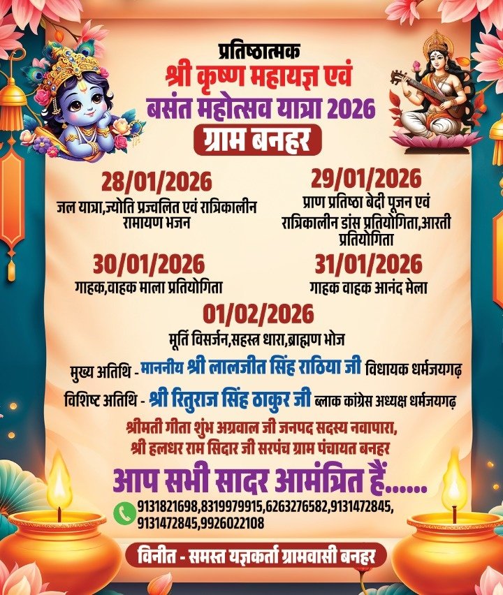 धरमजयगढ़ क्षेत्र के ग्राम बनहर में आगामी 28 जनवरी से 1 फरवरी 2026 तक प्रतिष्ठात्मक श्रीकृष्ण महायज्ञ एवं वसंत महोत्सव यात्रा का भव्य आयोजन किया जा रहा है। यह धार्मिक एवं सांस्कृतिक आयोजन पाँच दिनों तक चलेगा, जिसमें श्रद्धा, भक्ति और सांस्कृतिक गतिविधियों का संगम देखने को मिलेगा। आयोजन की शुरुआत 28 जनवरी को जल यात्रा, ज्योति प्रज्ज्वलन एवं रात्रिकालीन रामायण भजन से होगी। 29 जनवरी को प्राण प्रतिष्ठा देवी पूजन के साथ रात्रिकालीन डांस प्रतियोगिता एवं आरती प्रतियोगिता आयोजित की जाएगी। 30 जनवरी को गायन –वादन भजन प्रतियोगिता रखी गई है, वहीं 31 जनवरी को गायन –वादन एवं आनंद मेला का आयोजन होगा। महोत्सव का समापन 1 फरवरी 2026 को मूर्ति विसर्जन, सहस्त्र धारा एवं ब्राह्मण भोज के साथ किया जाएगा। इस आयोजन में मुख्य अतिथि के रूप में माननीय श्री लालजीत सिंह राठिया जी, विधायक धरमजयगढ़ शामिल होंगे। वहीं विशिष्ट अतिथियों में श्री रितुराज सिंह ठाकुर जी, ब्लॉक कांग्रेस अध्यक्ष धरमजयगढ़, श्रीमती गीता शुंभ अग्रवाल जी, जनपद सदस्य नवापारा एवं श्री हलधर राम सिदार जी, सरपंच ग्राम पंचायत बनहर उपस्थित रहेंगे। आयोजन समिति एवं समस्त ग्रामवासी बनहर द्वारा क्षेत्रवासियों से अधिक से अधिक संख्या में उपस्थित होकर कार्यक्रम को सफल बनाने की अपील की गई है।