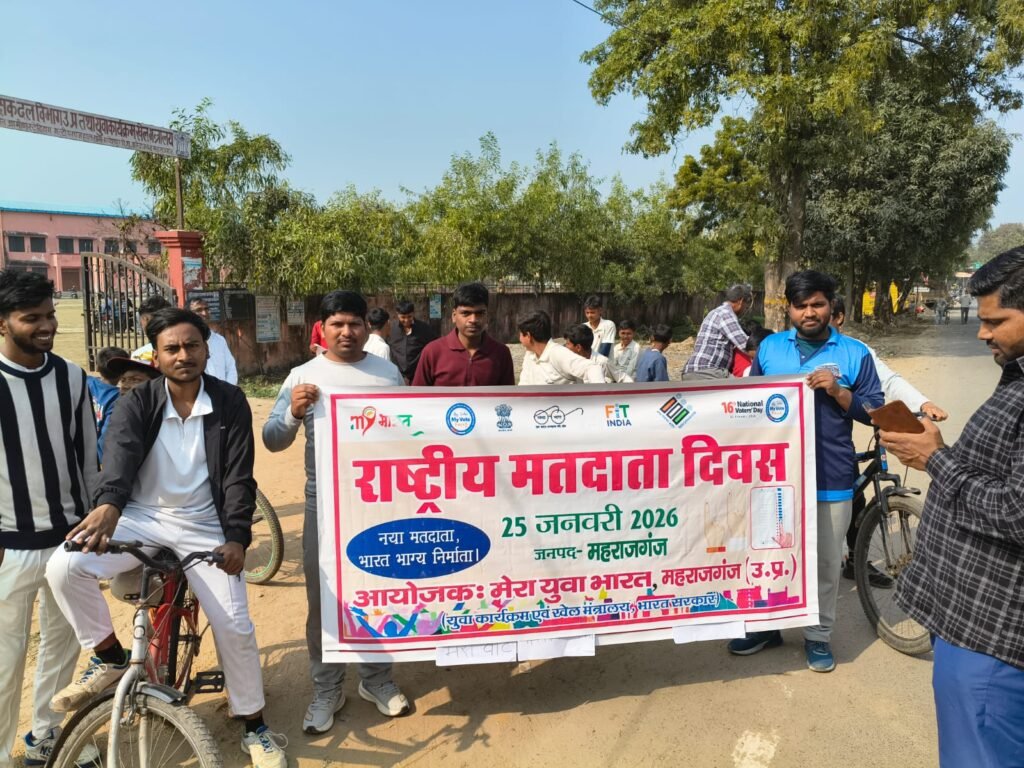 राष्ट्रीय मतदाता दिवस पर युवाओं को दिलाई गई शपथ आज दिनांक 25 जनवरी 2026 को मेरा युवा भारत महाराजगंज (युवा कार्यक्रम एवं खेल मंत्रालय भारत सरकार) के तत्वाधान मेरा युवा भारत के युवा मंडलों को मतदाता जागरूकता का शपथ दिलाया गया,जिसमें वि खण्ड फरेंदा के 20 युवा मंडल के युवाओं को शपथ दिलाया गया तथा साइकिल रैली निकाली गई,जिसमें मुख्य रूप से मथुरानगर,सिधवारी,अल्हड़ महादेवा,गोपालपुर शाह,पिपरा विशंभरपुर,ओढ़वलिया,निर्मम पूर्वी,आदि युवा मंडल के युवाओं ने भाग लिया कार्यक्रम का नेतृत्व युवा मंडल अध्यक्ष हृदेश कुमार यादव द्वारा किया गया कार्यक्रम में मुख्य रूप से क्षेत्रीय युवा कल्याण अधिकारी प्रवीण कुमार मिश्र,कृष्ण कुमार,रविन्द्र भारती,मुकेश,संजय,श्रीकेश यादव आदि लोग मौजूद रहे।
