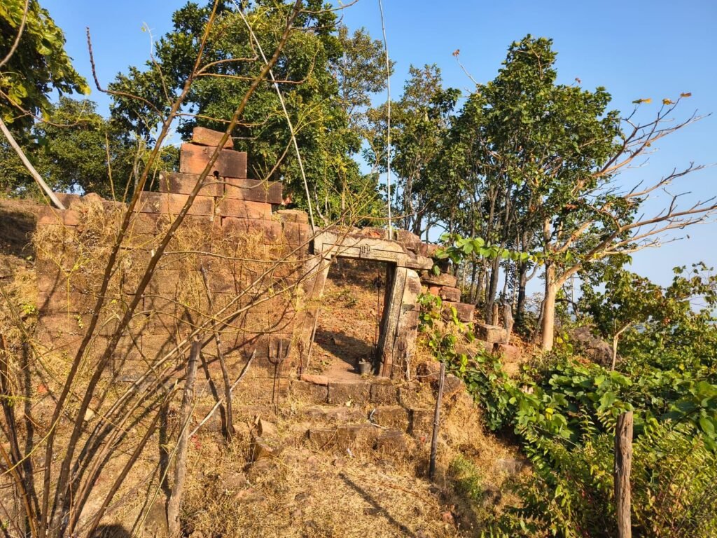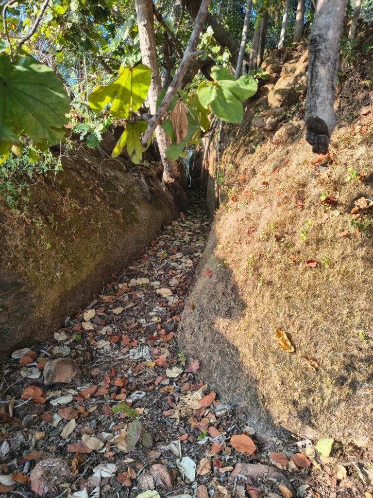 बदरा गांव के अंतिम छोर से धीरे-धीरे सिंदरी पहाड़ की ऊंचाइयों पर चढ़ते हुए हमने यहां के पेड़ पौधों के बारे में कुछ जानकारी लेनी चाहिए तब हमें पता चला कि इस पहाड़ी पर महुलाईन के पेड़ बहुत है। यह अपनी लंबी-लंबी बाहें फैलाए कभी-कभी 100 मीटर तक फैल जाती हैं जो पहाड़ों की ऊंचाइयों से ढलान की ओर कई जगह झूल गई है। बसंत के मौसम में इसी महुलाइन की लताओं में फूले हुए फूल इन पहाड़ों की वेणी की सुंदरता बढ़ाने बनाने वाली लताएं साबित करते हैं। महुलाइन की यही लटे गांव में रस्सी बनाने का मुख्य साधन है। जो पशुओं को बांधने से लेकर घर की छानी छप्पर में उपयोग की जाती है। वहीं ग्रामीण अर्थव्यवस्था को मजबूत करने में महुलाईन मुख्य भूमिका निभाता है। पत्तल- दोना बनाने के लिए ग्रामीण बाजार में इसे बेचा जाता है। कभी-कभी थोक खरीदार के आने पर पूरे गांव को रोजगार मिल जाता है। चढ़ाई के रास्ते पर जगह-जगह टूटे हुए पत्थरों का सिंदूरी रंग बिखरा हुआ अपना अलग सौंदर्य बिखेर रहा था। ऊंचाई पर पहुंचते हुए हम जैसे-जैसे ऊपर की ओर चल रहे थे हमें बीच में थोड़ी देर रुक कर पूरी सांस भरने की आवश्यकता महसूस हो रही थी। नौजवान साथियों की यह परीक्षा की घड़ी थी इसलिए वे आगे बढ़ते गए। ऊंचाई पर एक समतल स्थान मे पहुंचने के बाद हमने अपने सांसों को स्थिर किया और नीचे फैले हुए गांव का विस्तार देखा कुछ दूरी पर आगे पत्थरों से बने द्वार के भग्नावशेष ने हमें रोमांचित किया। इस स्वागत द्वार के किनारे के कई हिस्से टूट कर बिखर गए थे और इसी से आगे बढ़ती हुई एक गहरी खाई जैसी पत्थरों को काटकर बनाई गई आकृति ने हमें आश्चर्य से भर दिया। यह और इस स्थल को घेर कर ऐसी बनाई गई थी ताकि कोई भी बाहरी व्यक्ति आसानी से भीतर प्रवेश न कर सके। हमारी जिज्ञासा को समझते हुए जमींदार वंशज वीर विक्रम पुरी जी ने बताया कि कहा जाता है कि यह स्थल सैकड़ो वर्ष पहले मराठा लड़ाकों के छिपने का आश्रय स्थल रहा है। यही छिपकर वे अपनी युद्ध की तैयारी करते थे एवं अपनी सैन्य शक्ति एकत्र करने और युद्ध की नई-नई योजनाएं बनाया करते थे। 1897 से 1899 के बीच जब बैकुंठपुर एवं सोनहत की राजगद्दी खाली थी। उस समय दो बार मराठा लड़ाकू ने तत्कालीन रनई के गोंड जमीदारों से युद्ध किया था। , क्योंकि उस समय कोरिया रियासत के राजा नहीं होने के कारण यह क्षेत्र उनके जमीदारी का हिस्सा था और उसकी सुरक्षा के लिए जमीदार के सैनिकों ने दो बार मराठा लड़ाको को पराजित कर वापस भेज दिया। ऐसा माना जाता है कि उन्हें मराठा लड़ाकों का यह निवास और सैनिक स्थल रहा होगा। जो निर्माण में अधूरा ही रह गया। कभी-कभी प्राकृतिक घटनाओं पर आश्चर्य होता है कि इतनी ऊंचाई पर पीने का पानी कहां मिलता होगा, ऐसी स्थिति में नरपति सिंह हमें पहाड़ के उस ऊंचाई पर 