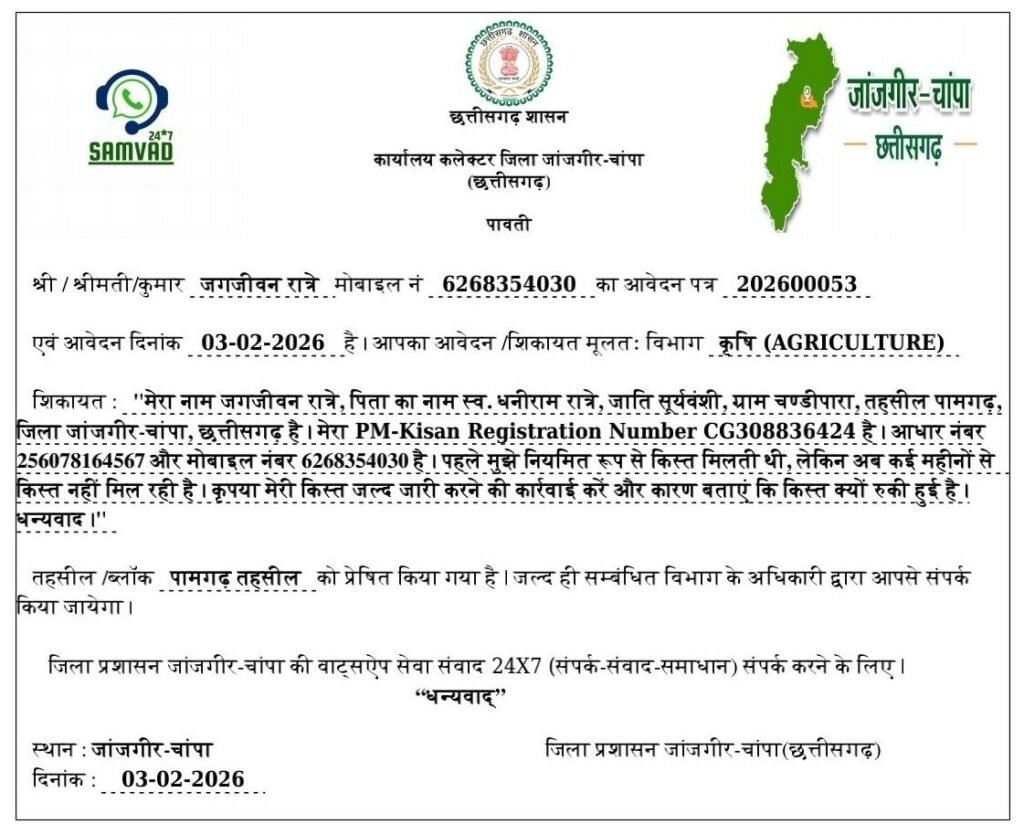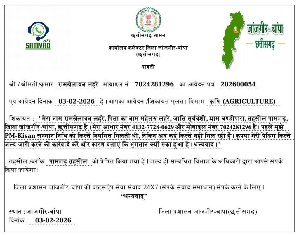 जांजगीर-चांपा। जिले के पामगढ़ तहसील में PM-Kisan Samman Nidhi योजना की पेंडिंग किस्तों को लेकर दो किसानों ने शिकायत दर्ज की है। दोनों ही शिकायतें 3 फरवरी 2026 को सम्वाद 24×7 प्लेटफॉर्म पर दर्ज हुईं, और जिला प्रशासन ने इन्हें तुरंत कृषि विभाग को प्राथमिकता पर भेज दिया है।