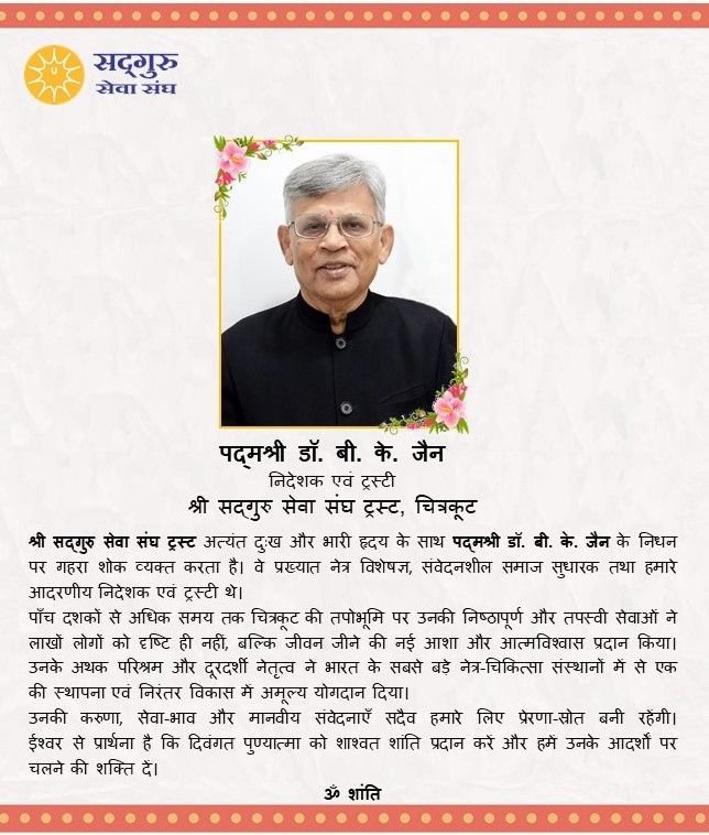 चित्रकूट की बड़ी खबर- नहीं रहे सद्गुरु सेवा संघ ट्रस्ट जानकी कुण्ड के डायरेक्टर पदम श्री डॉक्टर बी० के० जैन, मुंबई में चल रहा था इलाज,बविगत कई माह से चल रहे थे बीमार, सद्गुरु सेवा संघ ट्रस्ट के माध्यम से सेवा देते हुए करोड़ों लोगों की आंखों का इलाज किया, स्वामी रणछोड़ दास जी महाराज के कृपा पात्र रहे हैं डॉक्टर बी के जैन. उन्हीं के दिखाएं रास्ते में चलते हुए डॉक्टर बीके जैन चित्रकूट में संत समाज, गरीबों, सहयोग और नेत्र रोगियों के लिए असाधारण कार्य करके समाज में एक बड़ी मिशाल पेश की है. डॉ बीके जैन द्वारा किया गया यह कर सदियों तक याद किया जाएगा… सद्गुरु संघ ट्रस्ट परिवार ने की पुष्टि वेंटिलेटर से हटते ही शाम 4:24 मे जानकी कुंड चिकित्सालय में डॉ बी के जैन ने ली अंतिम सांस.