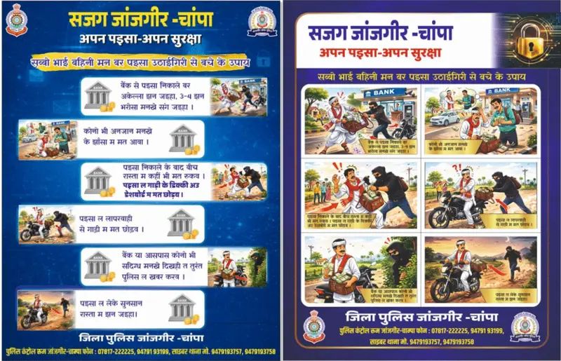 जांजगीर-चांपा जिले में किसानों की सुरक्षा को लेकर पुलिस अलर्ट, बैंक से पैसे निकालकर लौट रहे किसानों से ठगी रोकने हेतु सख्त कार्रवाई, एसपी विजय कुमार पाण्डेय (IPS) ने किया जागरूकता पोस्टर का विमोचन