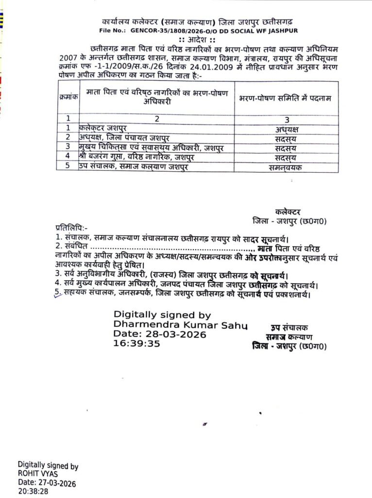 **जशपुरनगर | 30 मार्च 2026** **वरिष्ठ नागरिकों के अधिकारों के संरक्षण हेतु जिला स्तरीय समिति का गठन** छत्तीसगढ़ शासन के समाज कल्याण विभाग द्वारा ‘माता-पिता एवं वरिष्ठ नागरिकों का भरण-पोषण तथा कल्याण अधिनियम 2007’ के प्रावधानों के तहत जशपुर जिले में भरण-पोषण अपील अधिकरण एवं समिति का विधिवत गठन किया गया है। इस पहल का मुख्य उद्देश्य जिले के बुजुर्गों को सामाजिक सुरक्षा प्रदान करना और उनके भरण-पोषण से संबंधित विवादों का त्वरित एवं प्रभावी निराकरण सुनिश्चित करना है। **कलेक्टर की अध्यक्षता में कार्य करेगी उच्च स्तरीय समिति** नवनियुक्त समिति के ढांचे में **कलेक्टर जशपुर** को अध्यक्ष का दायित्व सौंपा गया है।