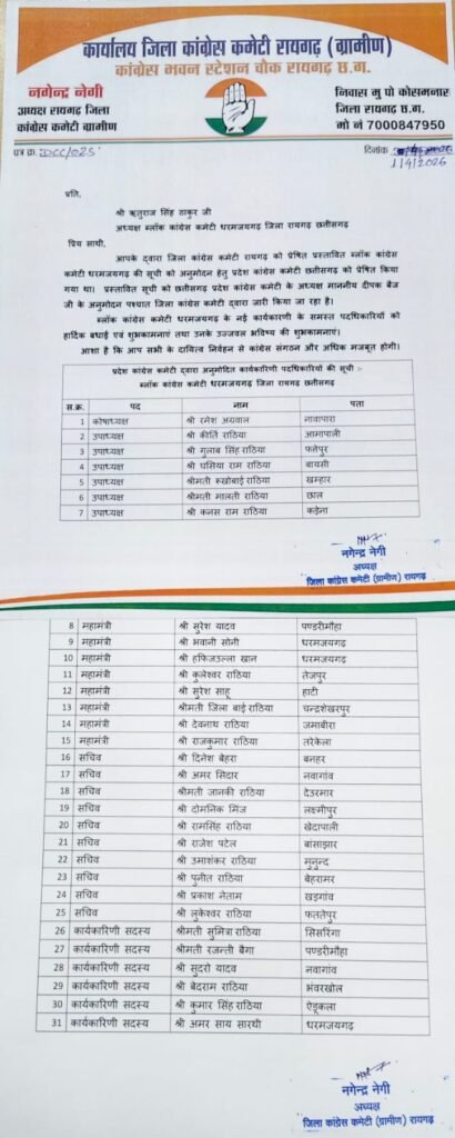 धरमजयगढ़ – कांग्रेस संगठन को जमीनी स्तर पर मजबूत करने की दिशा में एक महत्वपूर्ण कदम उठाते हुए प्रदेश कांग्रेस अध्यक्ष दीपक बैज के अनुमोदन एवं क्षेत्र के लोकप्रिय विधायक लालजीत सिंह राठिया की अनुशंसा पर जिला कांग्रेस अध्यक्ष नगेन्द्र नेगी द्वारा ब्लॉक कांग्रेस कमेटी धरमजयगढ़ की नई कार्यकारिणी की सूची जारी कर दी गई है। जारी सूची में विभिन्न पदों पर नए पदाधिकारियों की नियुक्ति की गई है, जिससे संगठन में नई ऊर्जा और सक्रियता का संचार होने की उम्मीद जताई जा रही है। पार्टी कार्यकर्ताओं एवं समर्थकों में इस घोषणा को लेकर उत्साह का माहौल देखा जा रहा है। नवनियुक्त पदाधिकारियों को बधाई देते हुए वरिष्ठ नेताओं ने विश्वास व्यक्त किया है कि सभी पदाधिकारी संगठन की मजबूती, जनसंपर्क विस्तार एवं पार्टी की नीतियों को जन-जन तक पहुंचाने में महत्वपूर्ण भूमिका निभाएंगे। साथ ही यह भी उम्मीद जताई गई कि नई टीम के गठन से क्षेत्र में कांग्रेस पार्टी के कार्यक्रमों का संचालन और अधिक प्रभावी एवं संगठित तरीके से किया जा सकेगा। राजनीतिक जानकारों का मानना है कि यह नियुक्तियां आगामी राजनीतिक गतिविधियों और चुनावी तैयारियों को ध्यान में रखते हुए की गई हैं, जिससे धरमजयगढ़ क्षेत्र में कांग्रेस की स्थिति और सुदृढ़ हो सके।