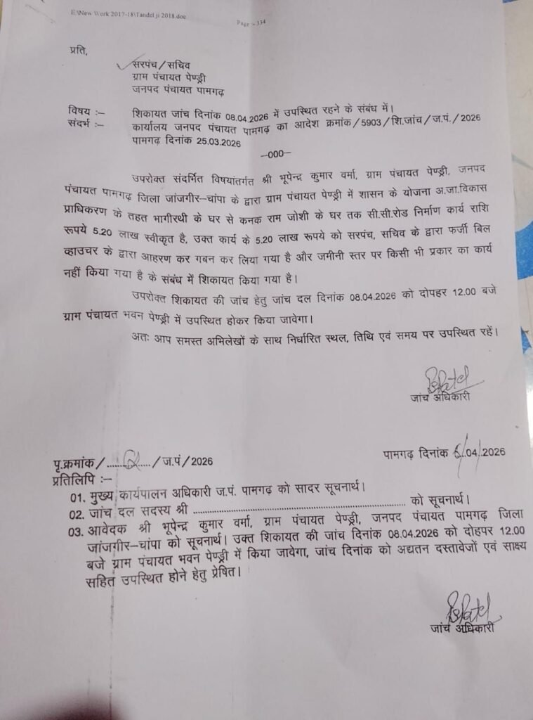 рдЬрдирдкрдж рдкрдВрдЪрд╛рдпрдд рдкрд╛рдордЧрдврд╝ рдХреЗ рдЖрджреЗрд╢ рдХреНрд░рдорд╛рдВрдХ 5903/рд╢рд┐.рдЬрд╛./рдЬ.рдк./2026 рджрд┐рдирд╛рдВрдХ 25.03.2026 рдХреЗ рдЖрдзрд╛рд░ рдкрд░ рдЬрд╛рдВрдЪ рд╢реБрд░реВ рдХреА рдЧрдИ рд╣реИред рдЬрд╛рдВрдЪ рджрд▓ рджрд┐рдирд╛рдВрдХ 08.04.2026 (рдХрд▓) рдХреЛ рджреЛрдкрд╣рд░ 12:00 рдмрдЬреЗ рдЧреНрд░рд╛рдо рдкрдВрдЪрд╛рдпрдд рднрд╡рди рдкреЗрдгреНрдбреНрд░реА рдореЗрдВ рдкрд╣реБрдВрдЪрдХрд░ рдЬрд╛рдВрдЪ рдХрд░реЗрдЧрд╛ред