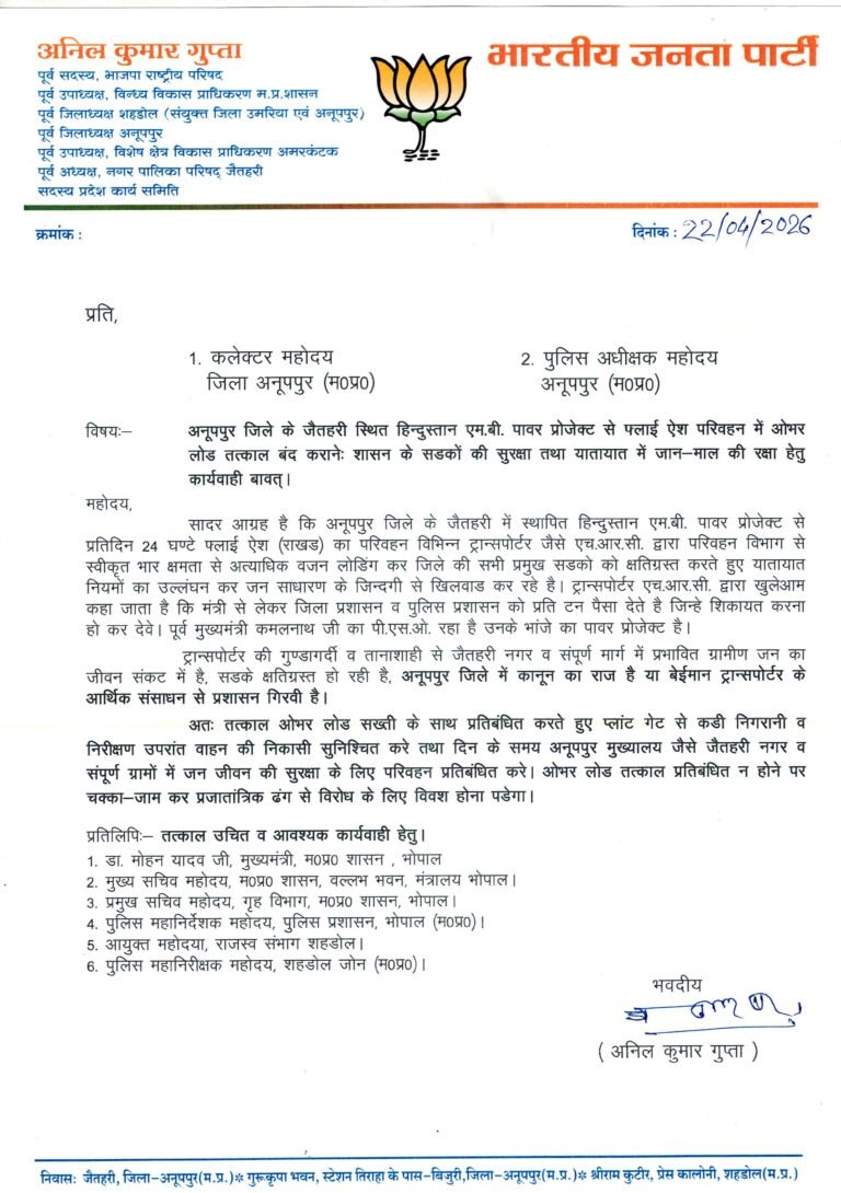सड़कों को नुकसान और जनजीवन खतरे में, कार्रवाई न होने पर चक्का जाम की चेतावनी स्थान/डेटलाइन: अनूपपुर, 22 अप्रैल 2026...