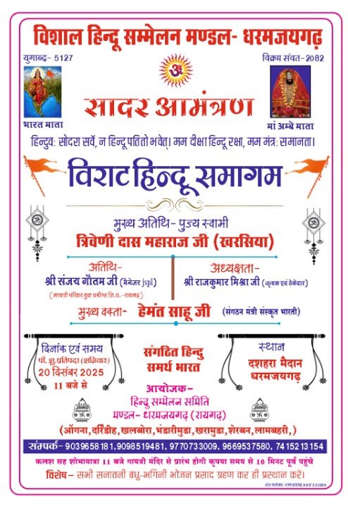 धरमजयगढ़ में हिन्दू समाज को संगठित करने और सांस्कृतिक चेतना को सुदृढ़ करने के उद्देश्य से विशाल हिन्दू समागम का...