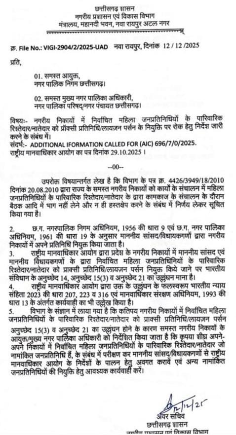 संभाग ब्यूरो दुर्गा गुप्ता नवा रायपुर। छत्तीसगढ़ शासन के नगरीय प्रशासन एवं विकास विभाग ने प्रदेश के समस्त नगरीय निकायों...